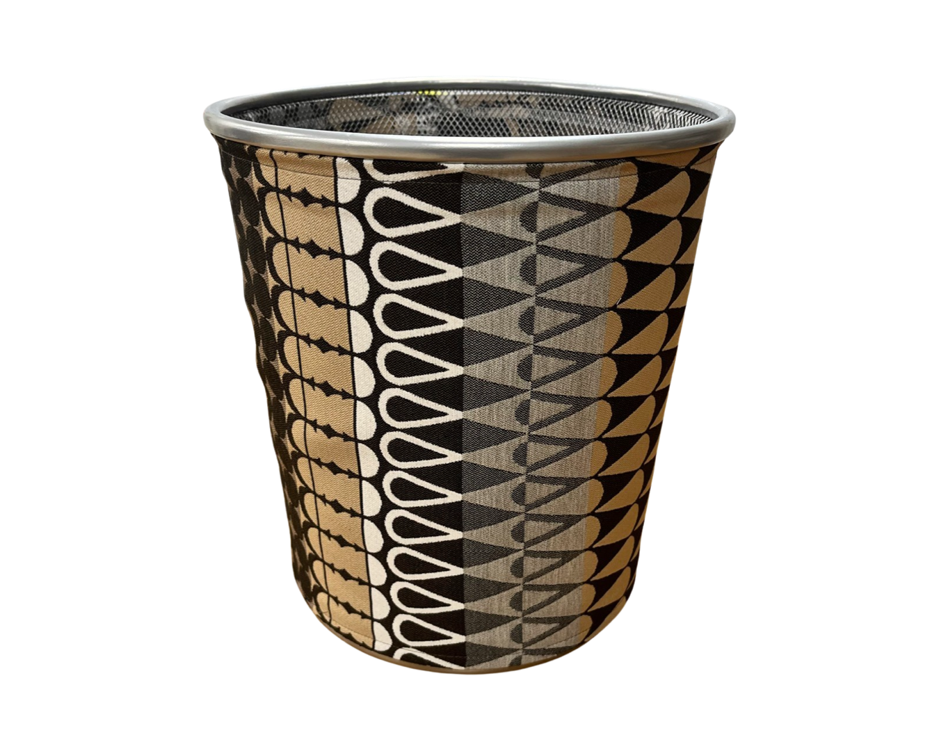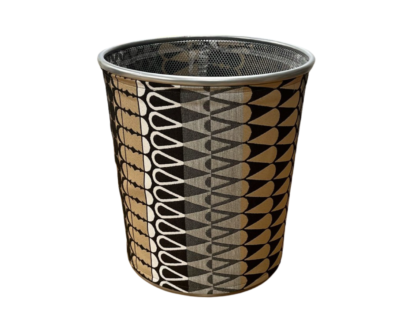 A 4 gallon decorative fabric waste basket cover tightly fit over a Silver Mesh metal wire trash can made with luxurious designer fabrics from all over the world. Metal Wire Wastebaskets, Waste Basket Trash Can, Recycling Garbage Container Bin for Office, or Bedroom Silver Mesh Trash Cans 4 Gallon.