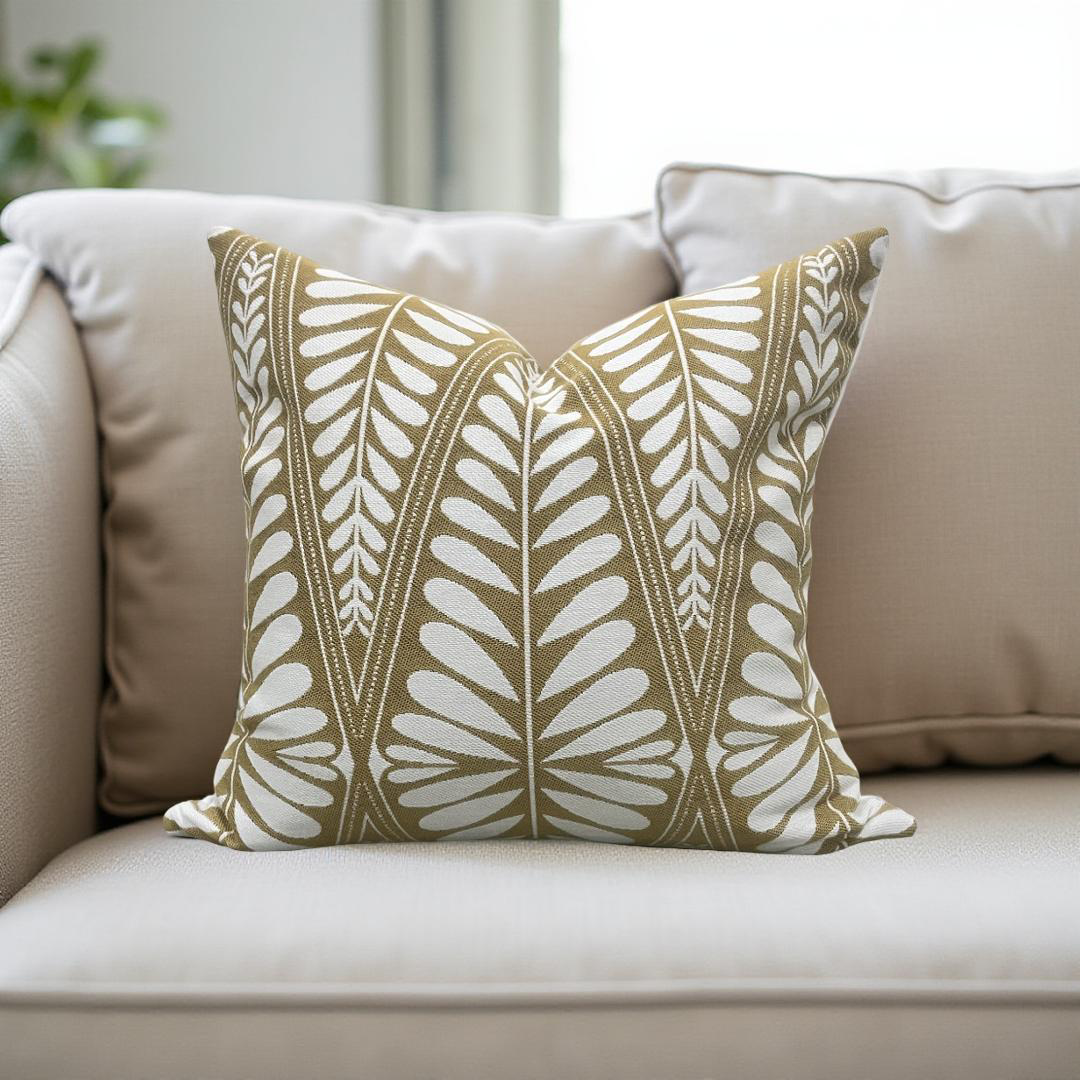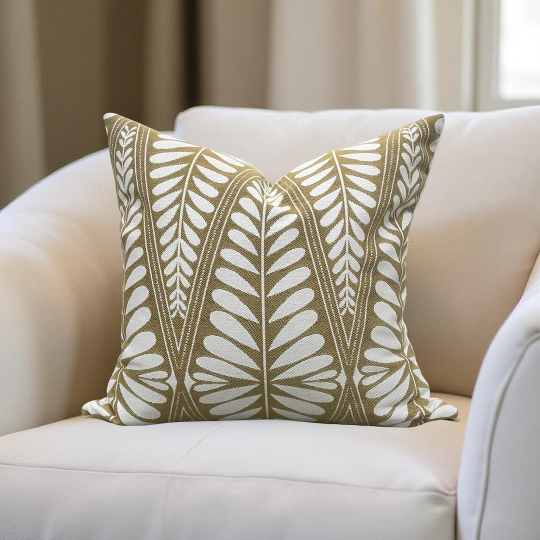 Bring the Midas touch to your home décor with this 18x18 inch decorative throw pillow crafted from the exquisite Moi Marche Out Gold fabric. This striking pillow features a captivating blend of gold and off-white/ivory hues, making it a versatile addition that complements a variety of design aesthetics