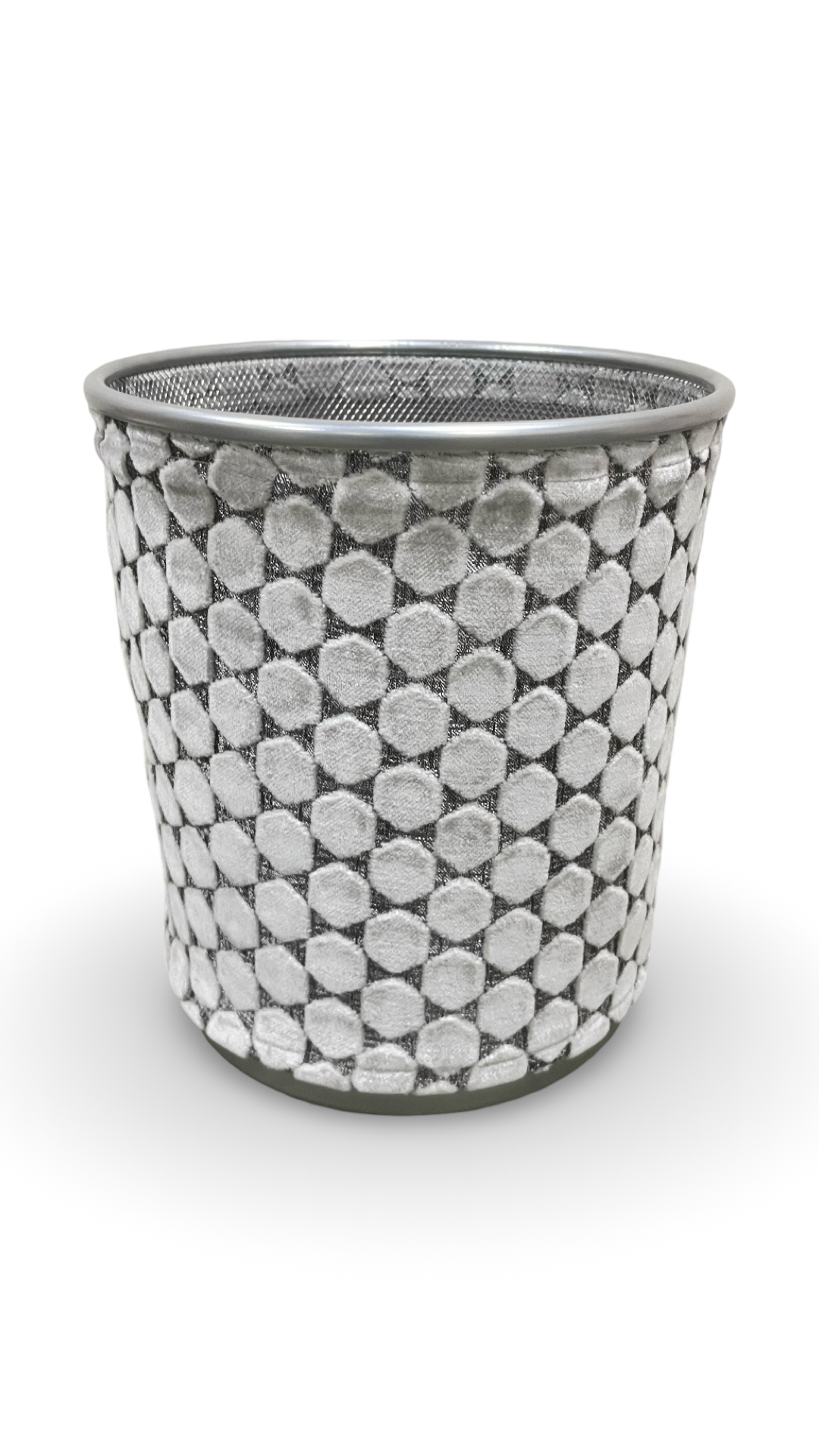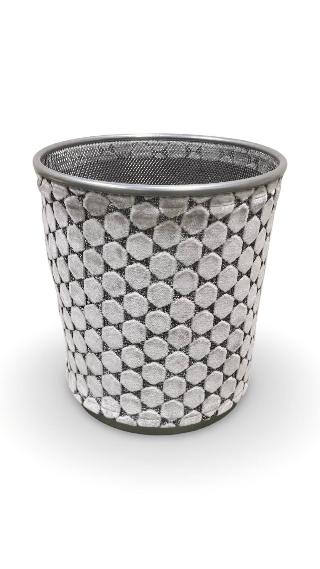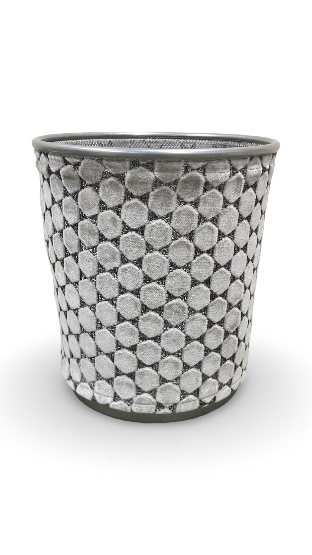 This 4 gallon decorative fabric waste basket cover tightly fits over a Silver Mesh metal wire trash can made with luxurious designer fabrics from all over the world.