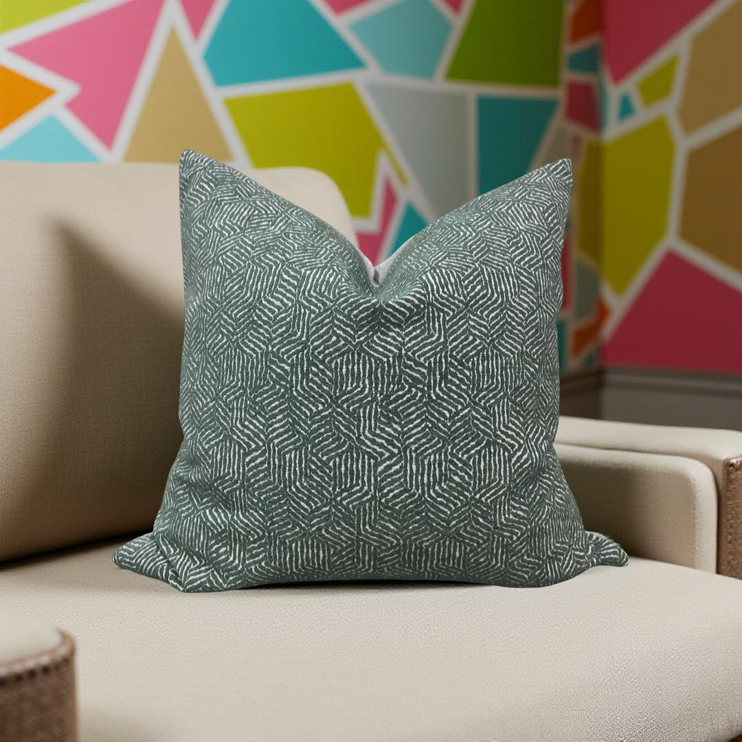 This luxurious 22x22 inch decorative pillow is crafted from the stunning Momentum Textiles - Faceted Fields-Peacock fabric.
