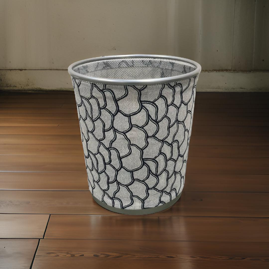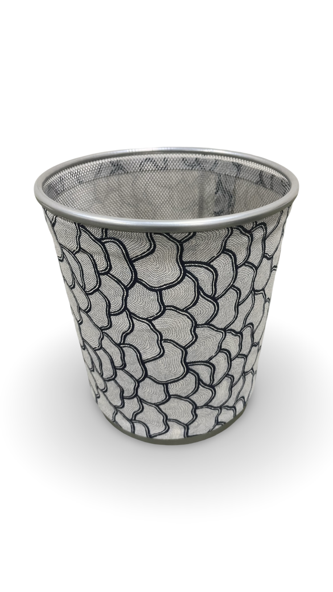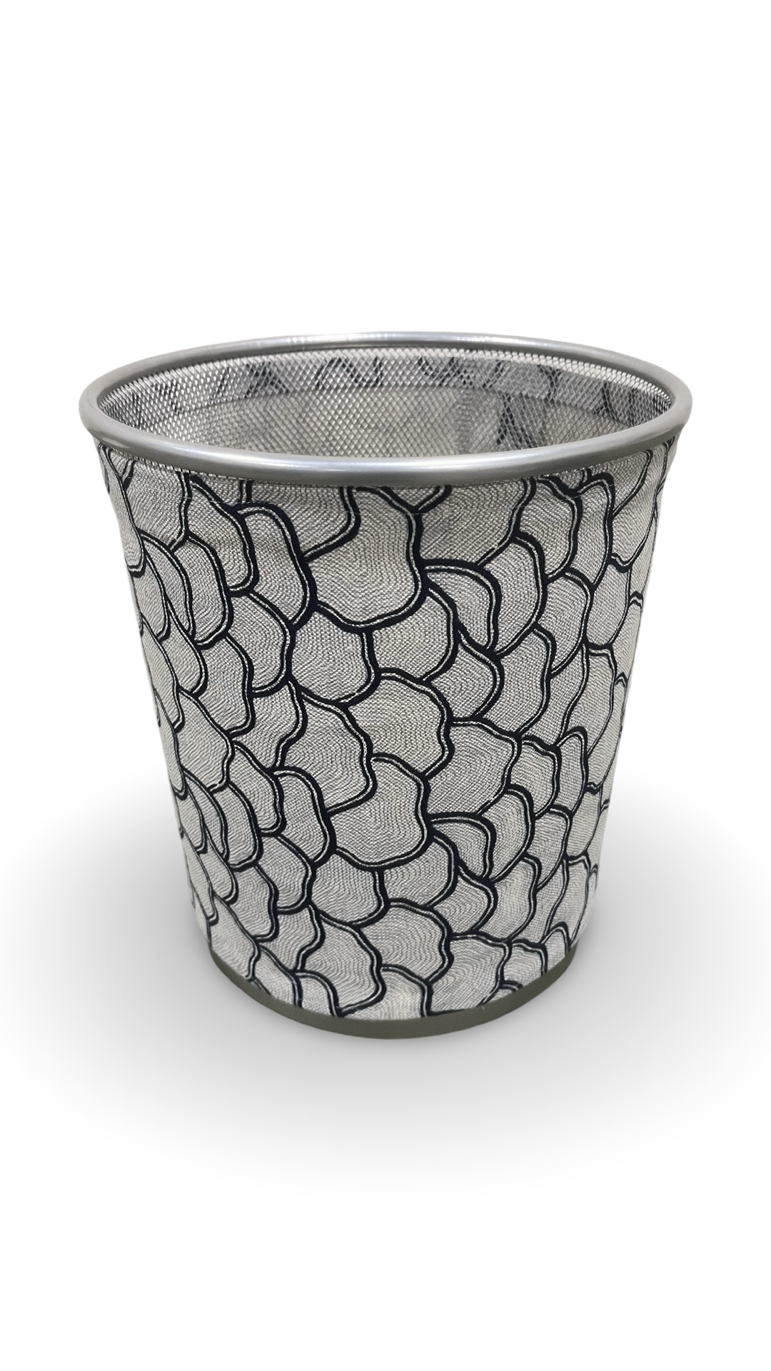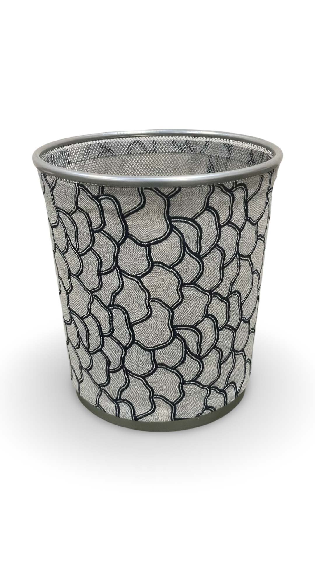This 4 gallon decorative fabric waste basket cover tightly fits over a Silver Mesh metal wire trash can made with luxurious designer fabrics from all over the world.