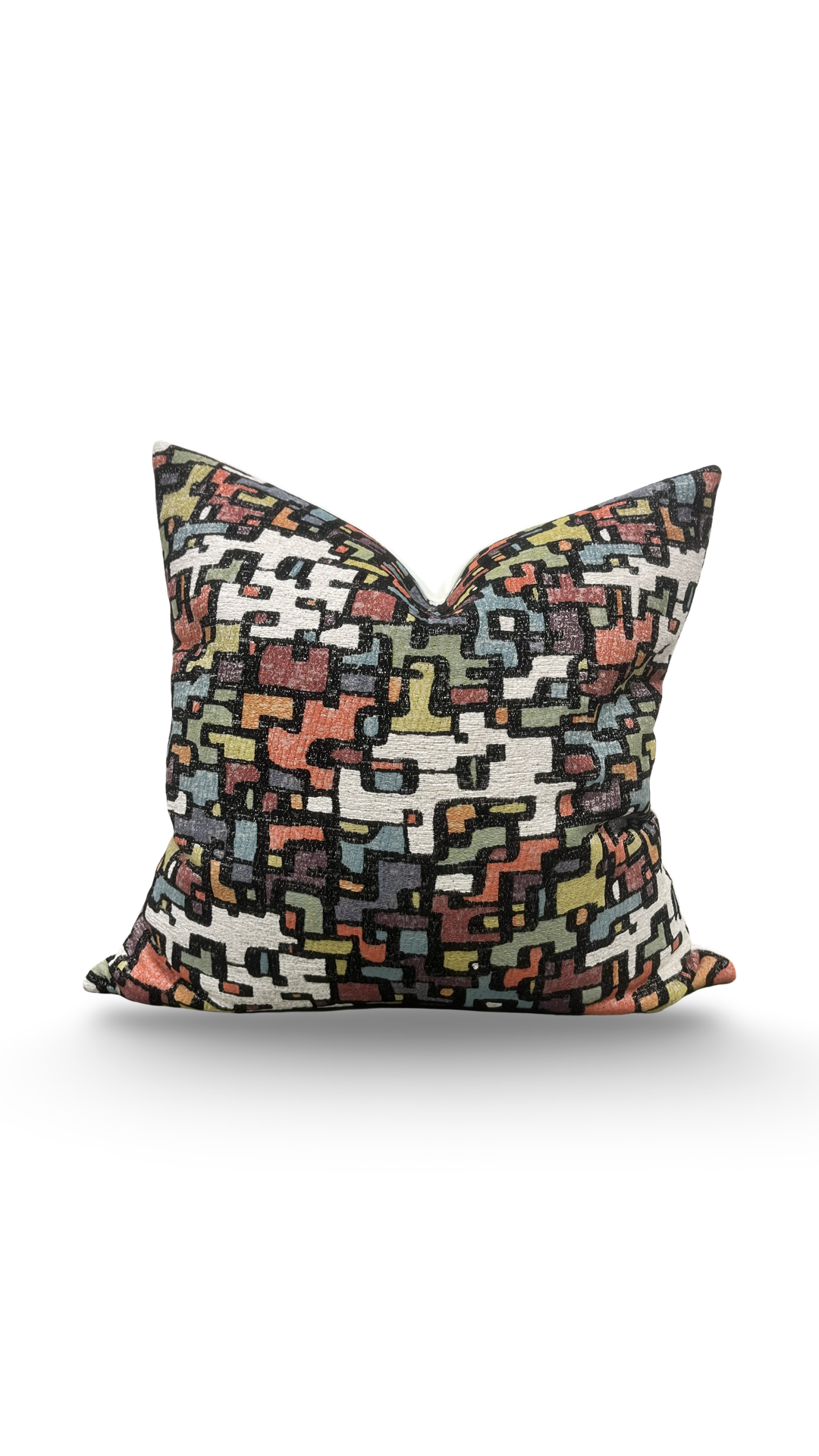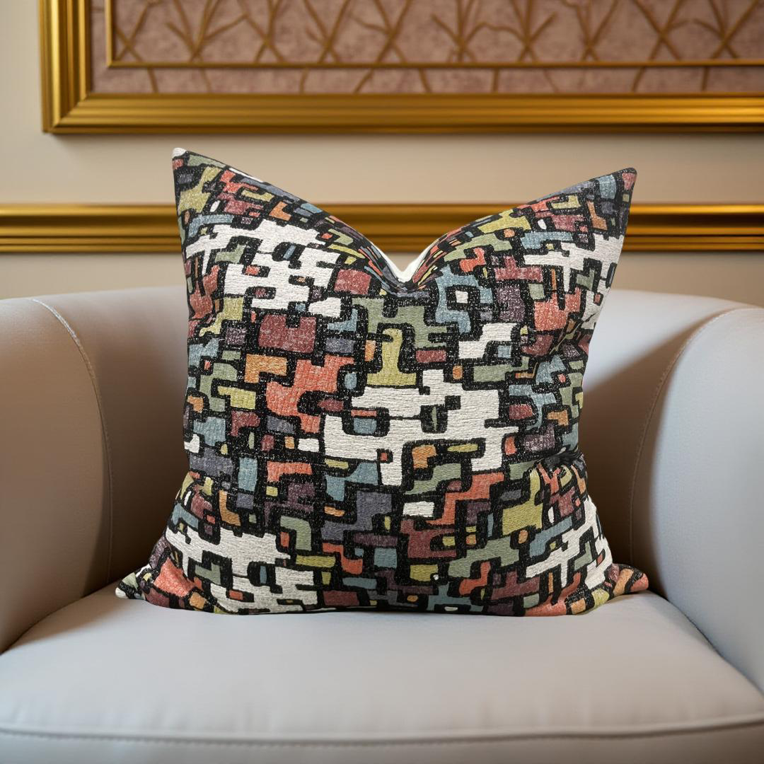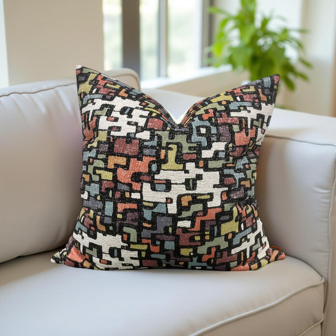 The 18x18 inch decorative pillow showcases the playful and vibrant Lazar Industries Puzzle Gumdrop fabric. This whimsical fabric features a delightful mix of bold, colorful patterns reminiscent of candy and playful puzzles, creating an inviting and cheerful atmosphere. The premium-quality fabric is soft to the touch, ensuring both comfort and durability. Designed to make a striking statement, this pillow is perfect for adding a pop of color to any living room, bedroom, or playful space. The hidden zipper closure provides a sleek look while allowing for easy maintenance and care. Whether used alone or as part of a coordinated set, this pillow elevates any decor with its fun and engaging design.