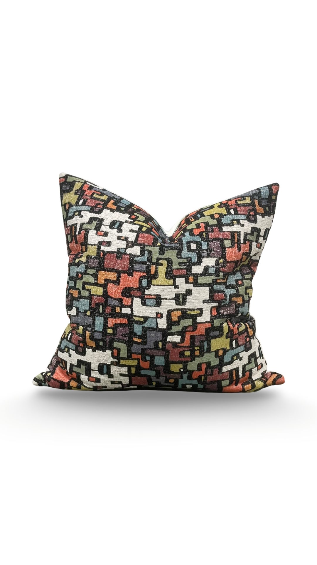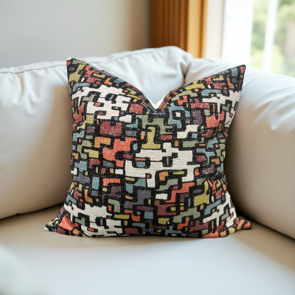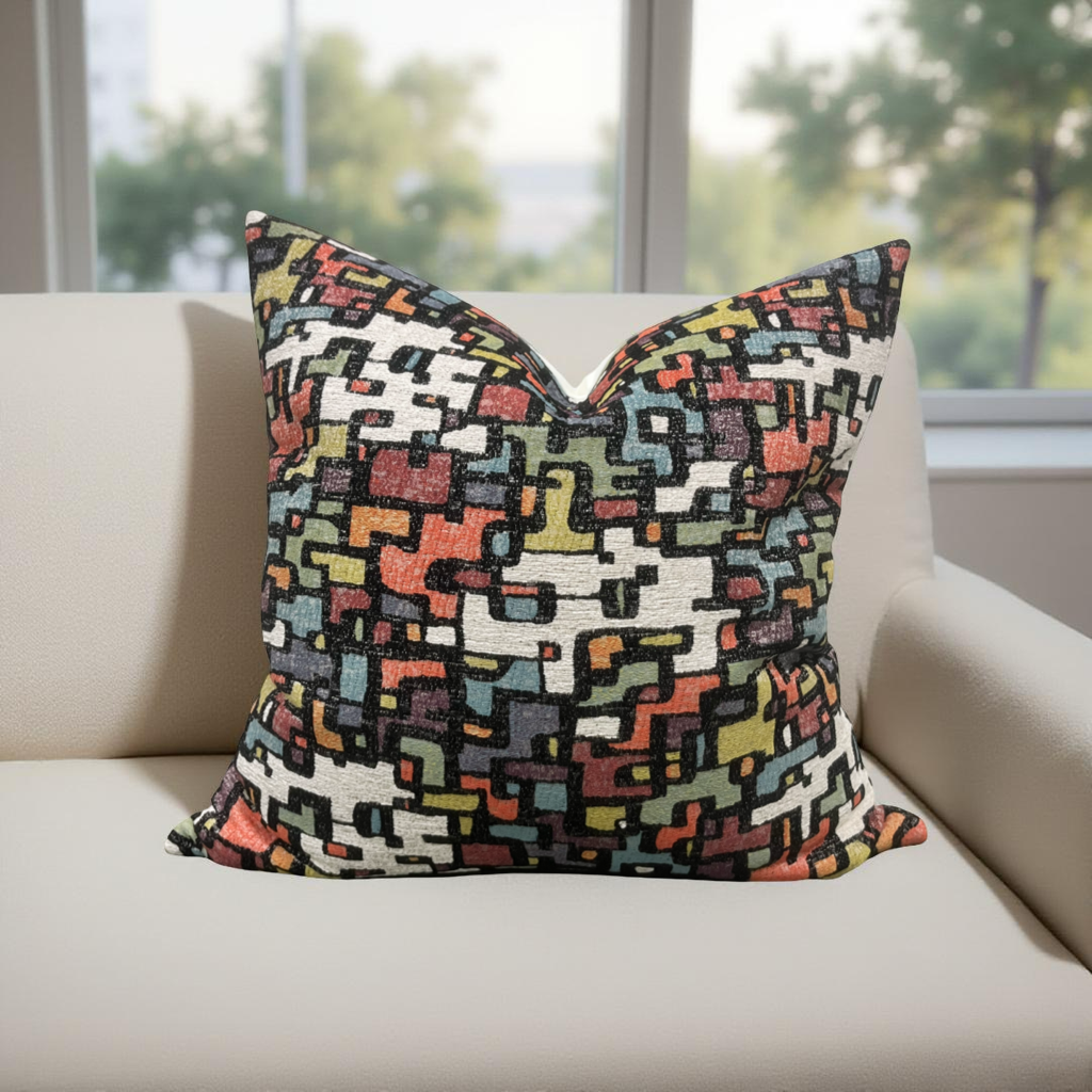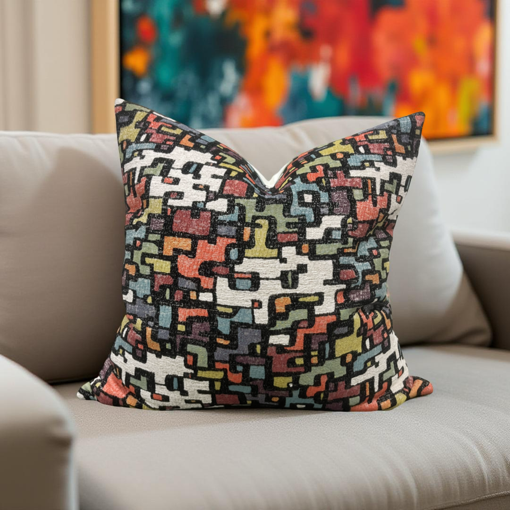 The 22x22 inch decorative pillow showcases the playful and vibrant Lazar Industries Puzzle Gumdrop fabric. This whimsical fabric features a delightful mix of bold, colorful patterns reminiscent of candy and playful puzzles, creating an inviting and cheerful atmosphere. The premium-quality fabric is soft to the touch, ensuring both comfort and durability. Designed to make a striking statement, this pillow is perfect for adding a pop of color to any living room, bedroom, or playful space. The hidden zipper closure provides a sleek look while allowing for easy maintenance and care. Whether used alone or as part of a coordinated set, this pillow elevates any decor with its fun and engaging design.