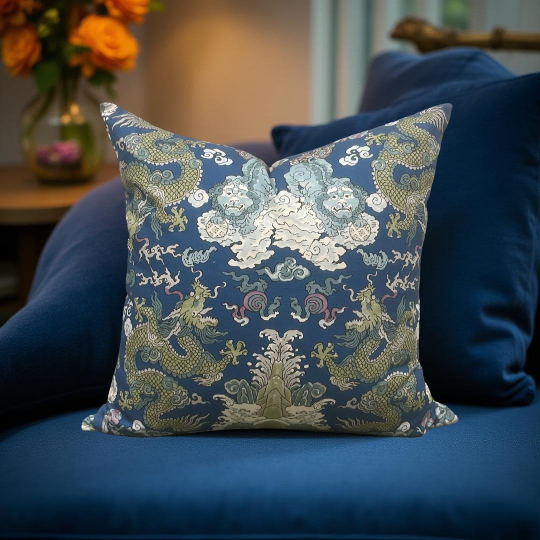features an adventurous and exotic chinoiserie design. The symmetrical print is animated with fire-breathing dragons and foo dogs set on a linen ground. This handcrafted pillow offers a unique and memorable statement for sophisticated spaces.